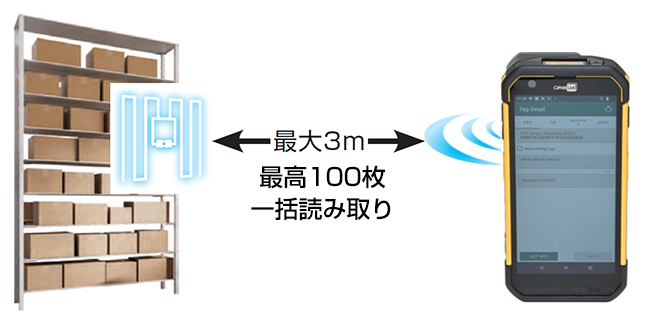 最大3mの範囲で最高100枚のタグの一括読み取りが可能。棚卸や検品に最適。